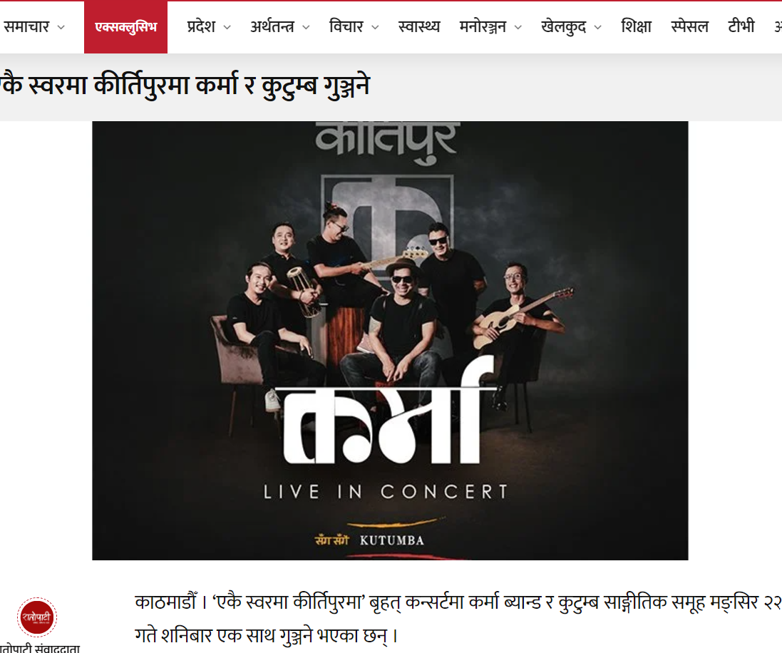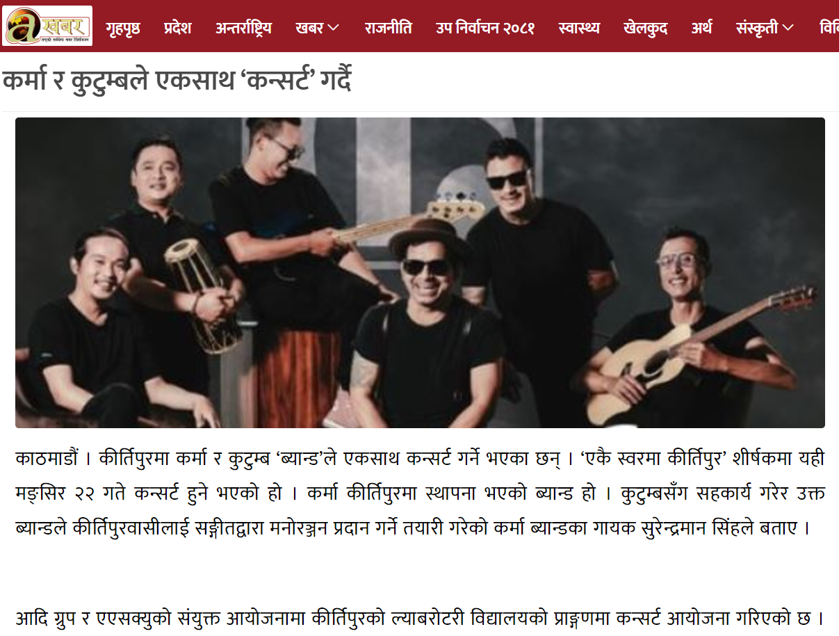 Read the news एकै स्वरमा कीर्तिपुरमा कर्मा र कुटुम्ब गुञ्जने Click here to read full news जुर्मुरायो कर्मा ब्याण्ड, कुटुम्बसँग मिलेर कीर्तिपुरमा गुञ्जिने Click here to read full news कीर्तिपुरमा कर्मा र कुटुम्ब एकै स्वरमा गुञ्जिने Click here to read full news कीर्तिपुरमा कर्मा र कुटुम्ब गुञ्जिने Click here to read full news ‘एकै स्वरमा कीर्तिपुरमा’ कर्मा र कुटुम्बको बृहत् कन्सर्ट Click here to read full news एकै स्वरमा कीर्तिपुरमा कर्मा र कुटुम्ब गुञ्जिने Click here to read full news कर्मा र कुटुम्बले एकसाथ ‘कन्सर्ट’ गर्दै Click here to read full news कर्मा र कुटुम्ब ब्याण्डको कीर्तिपुरमा लाइभ प्रस्तुति मंसिर २२ मा Click here to read full news कर्मा र कुटुम्बले एकसाथ ‘कन्सर्ट’ गर्दै Click here to read full news Previous Page1 Page2 Page3 Next